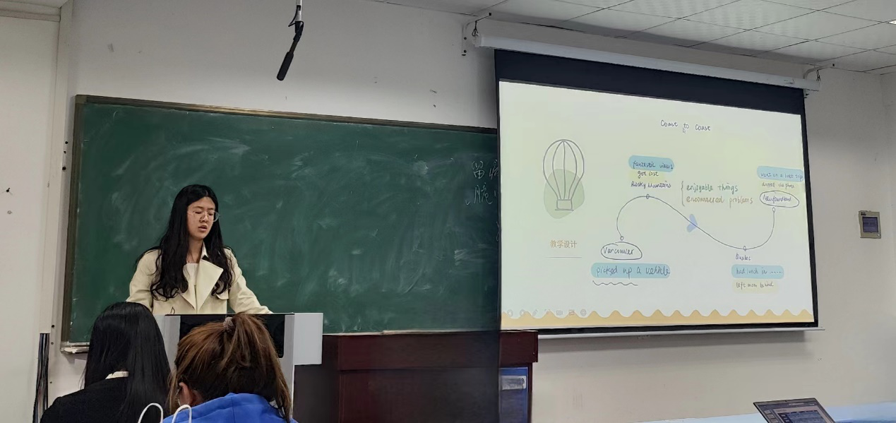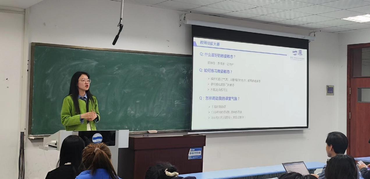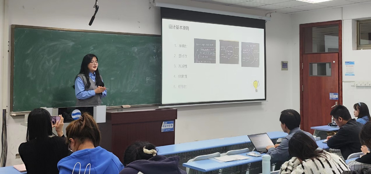 四位同学针对大赛提供了不同方面的策略。刘坪妤着重从教学设计、语音语调与教态两个方面进行分享,以阅读课和读写课为例,列举了教学方案以及PPT和逐字稿设计的基本流程;她同时为同学们推荐了相关学习资源,强调模仿的重要性。