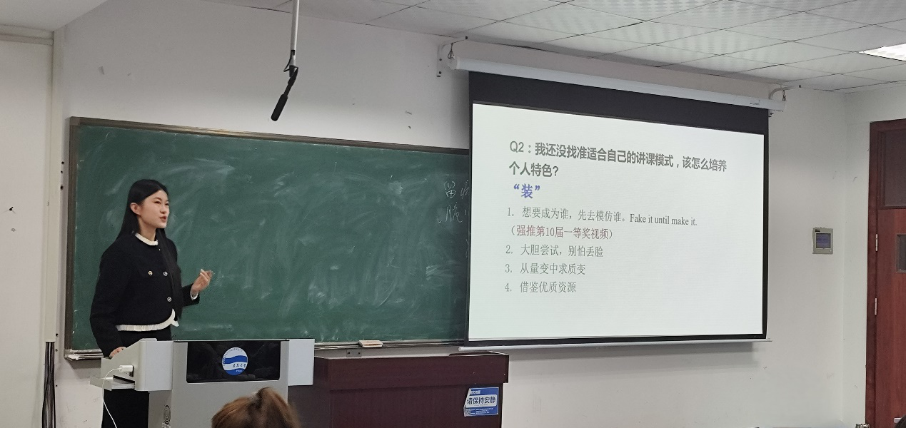 闫新怡以个人特色对教学设计的影响为切入点,分别为已形成自己风格和仍未有自己风格的同学提供了不同的建议,她主张在讲台上时刻发挥自己的优势,避免自己的短板;她也提到观看往年选手的比赛视频可以为备赛的同学们提供强有力的参考。