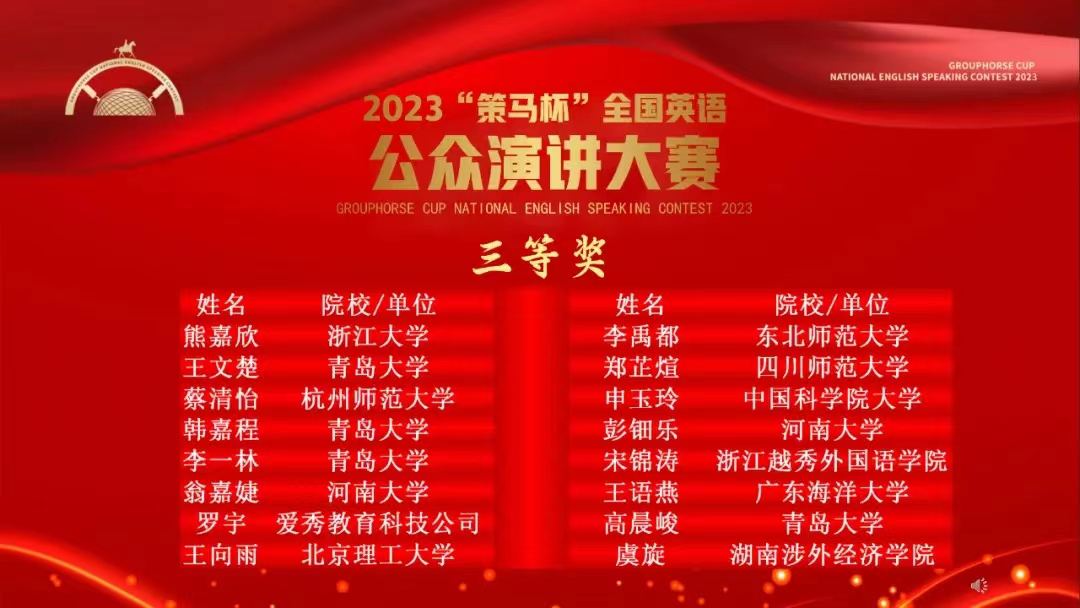2024年3月17日,由英国大使馆文化教育处/英国文化教育协会官方支持、英国皇家特许语言家学会和北京策马翻译有限公司(联合国官方翻译服务供应商)联合主办的 2023年“策马杯”全国英语公众演讲大赛全国总决赛在线举行。经过前期初赛和大区赛角逐,KY开元集团官网共有4位选手入围总决赛,并分别荣获国赛三等奖:王文楚(KY开元集团官网英语专业,指导教师:孙旻)、韩嘉程(KY开元集团官网语言大数据专业,指导教师:孙旻)、李一林(KY开元集团官网法语专业,指导老师:秦丹雪)、高晨峻(经济学院国际经济与贸易专业)。