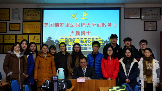 3月20日下午,美国佛罗里达国际大学(FIU)副教务长卢鹏博士到院进行访问交流。院长卞建华、副院长宫英瑞出席在博文楼312会议室举行的座谈会,西班牙语系主任陈皓、副主任栾勋业、2018届毕业生辅导员寇磊、外事服务秘书鞠阿楠、党政办主任扈炳良参加交流。