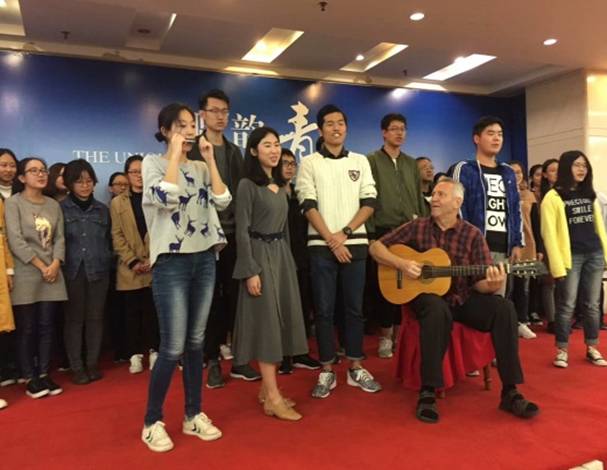 德意志学术交流中心专家、德语教学系外教Detlef Gaertner博士带领德语专业学生,为来访的巴州代表团奉上德语诗朗诵、德语歌曲演唱等节目。巴州精英代表团、德语教学系的同学们还共同演唱了德国著名音乐家贝多芬的经典乐曲“欢乐颂”,将现场气氛推向高潮。最后,中德双方还互赠具有各自文化特色的小纪念,并希望彼此双方在更广泛、更高层次的领域不断建立新的交流与合作。