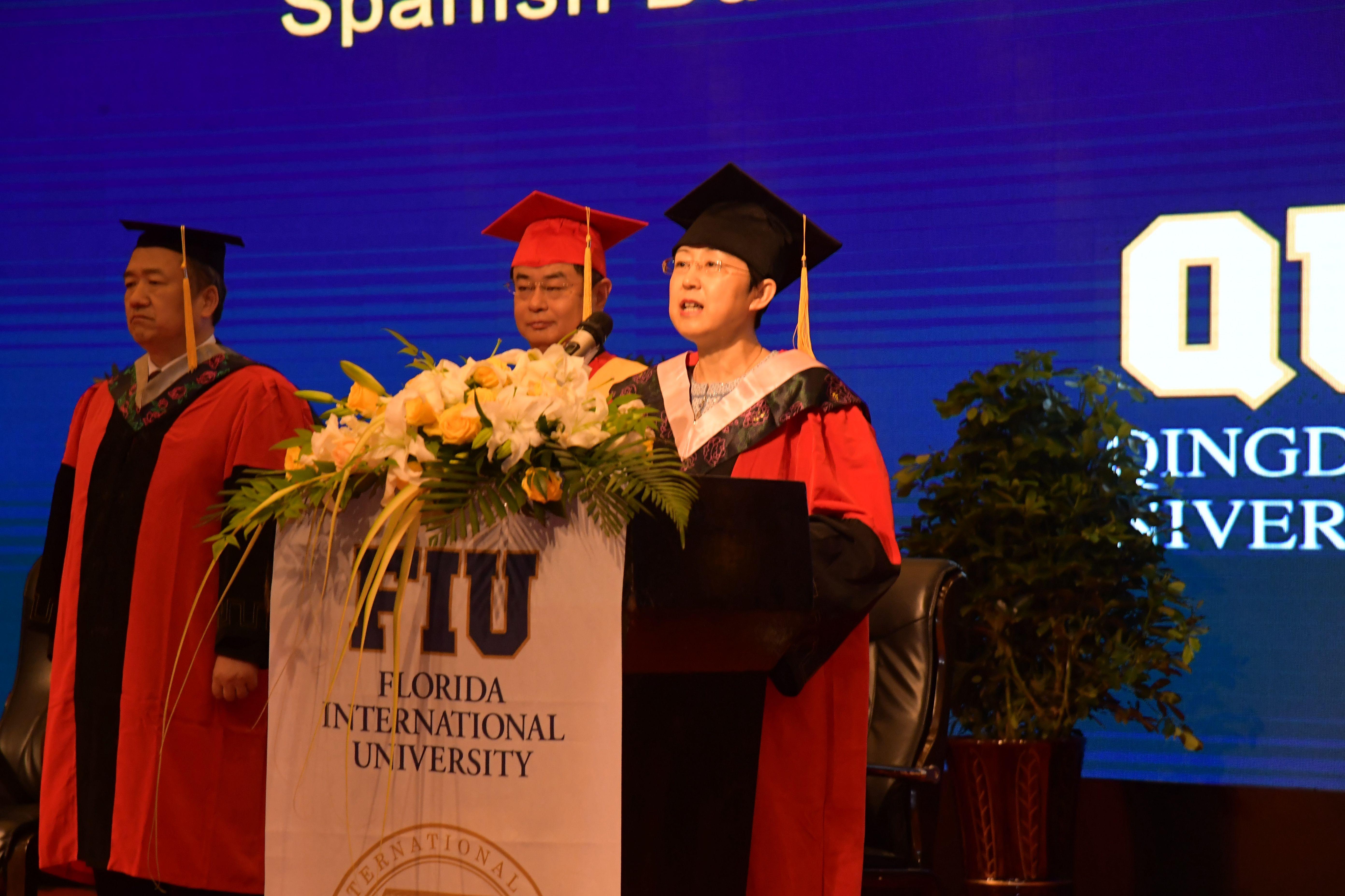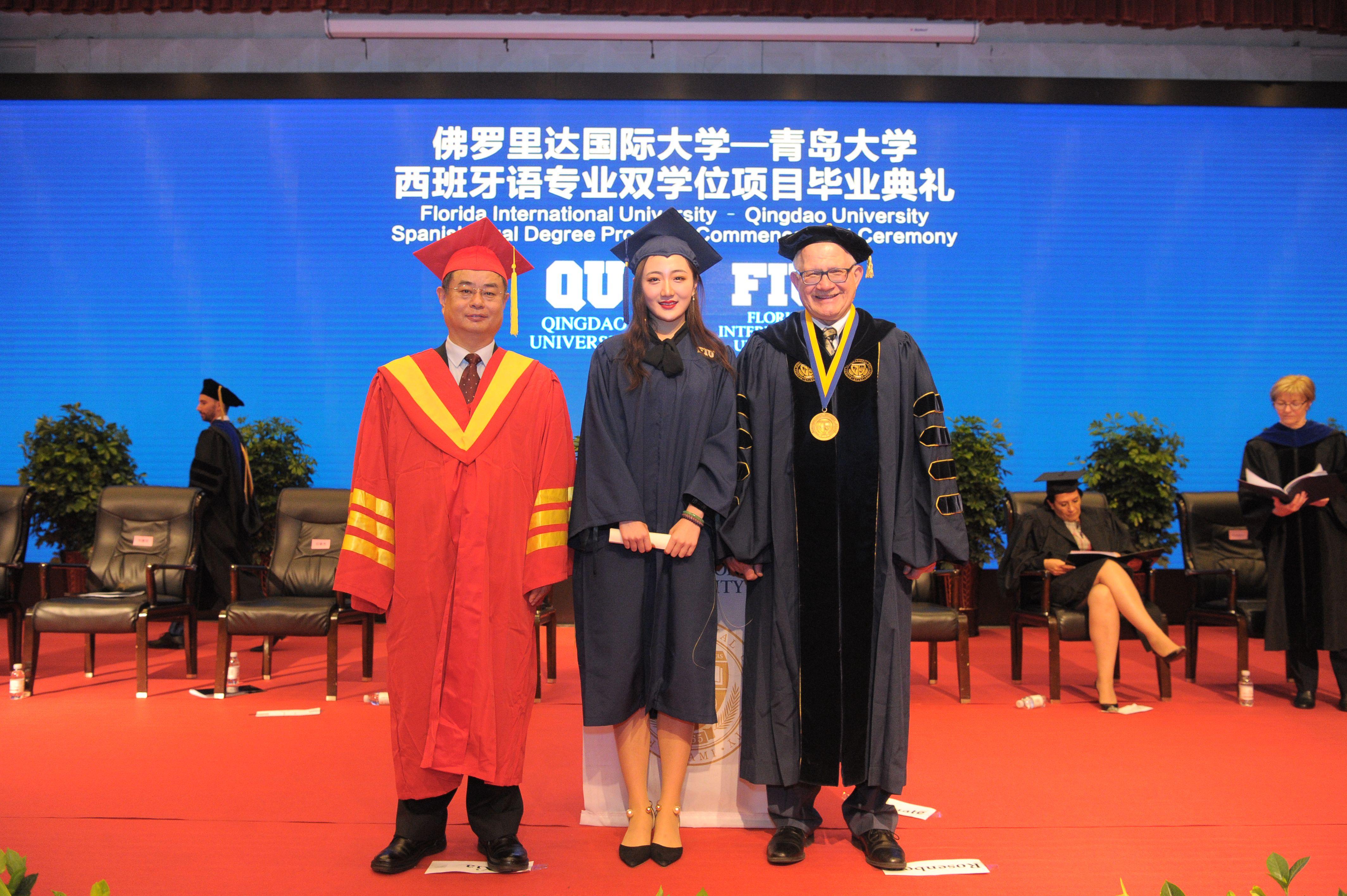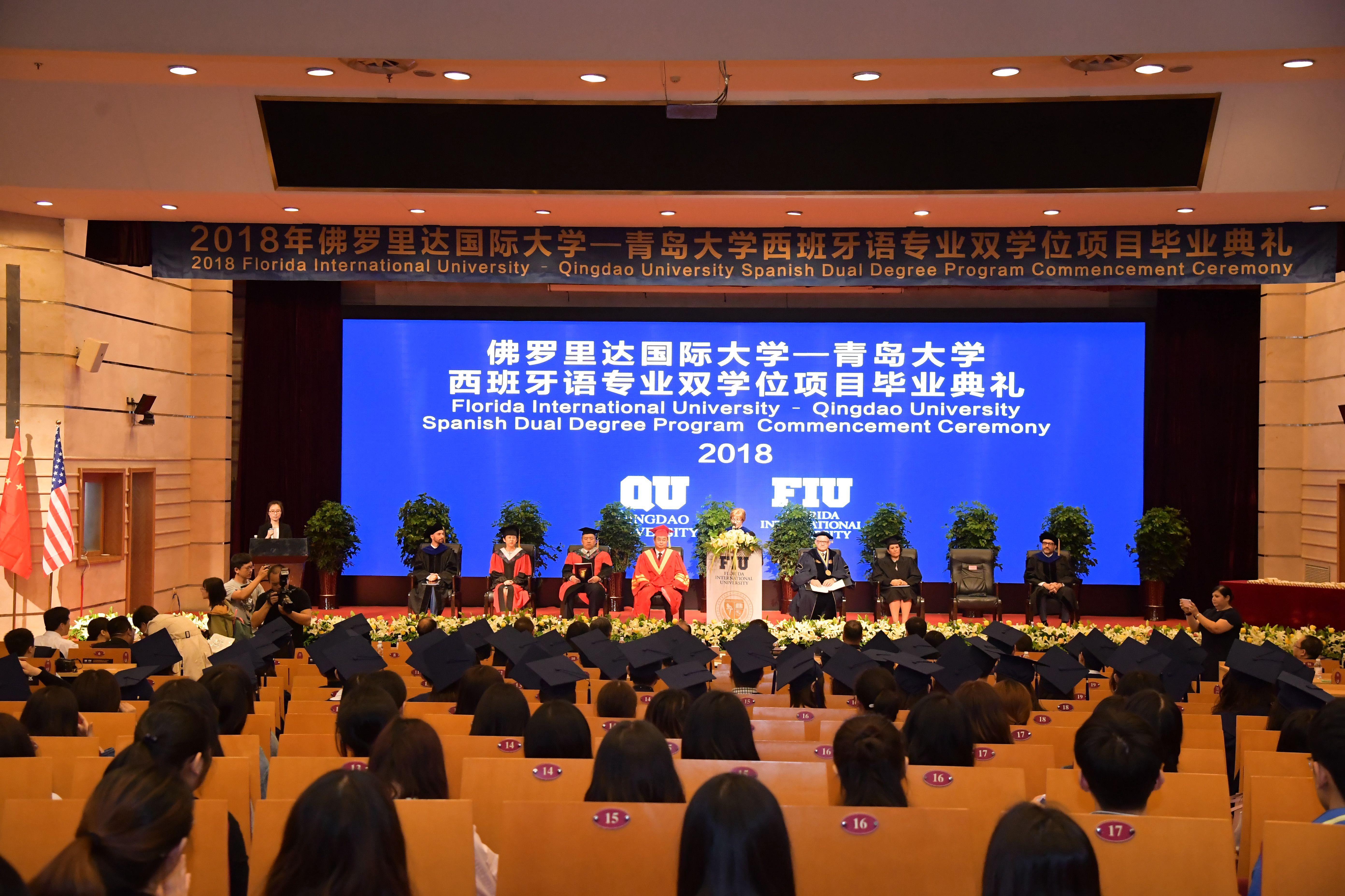 5月8日上午,佛罗里达国际大学-KY开元集团官网西班牙语专业双学位项目毕业典礼暨美方学位授予仪式,在国际学术交流中心博学厅举行。校长夏东伟,佛罗里达国际大学校长Mark Rosenberg出席典礼并致辞。校党委副书记仪垂杰,青岛市政府外事办主任牟俊典,青岛市委高校工委副书记、市教育局党委副书记车景华,青岛市商务局副巡视员徐健,海信集团副总裁、海信国际营销公司董事长林澜,海尔集团电器产业有限公司总经理、青岛海永顺新能源科技有限公司董事长孙永乐出席典礼。KY开元集团官网院长卞建华作为大典礼官主持开场式。