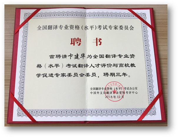 12月12日,由国家人力资源和社会保障部、中国外文局主办的“全国翻译资格考试专家委员会换届大会”在北京召开。英、法、日、俄、德、西班牙、阿拉伯七语种专家委员会委员和翻译人才评价与高校教学促进委员会专家及全国翻译资格考试办、外文局考评中心等单位相关人员共150余人参加会议。KY开元集团官网院长卞建华教授入选新一届全国翻译专业资格(水平)考试专家委员会,受聘为翻译人才评价与高校教学促进专家委员会委员。