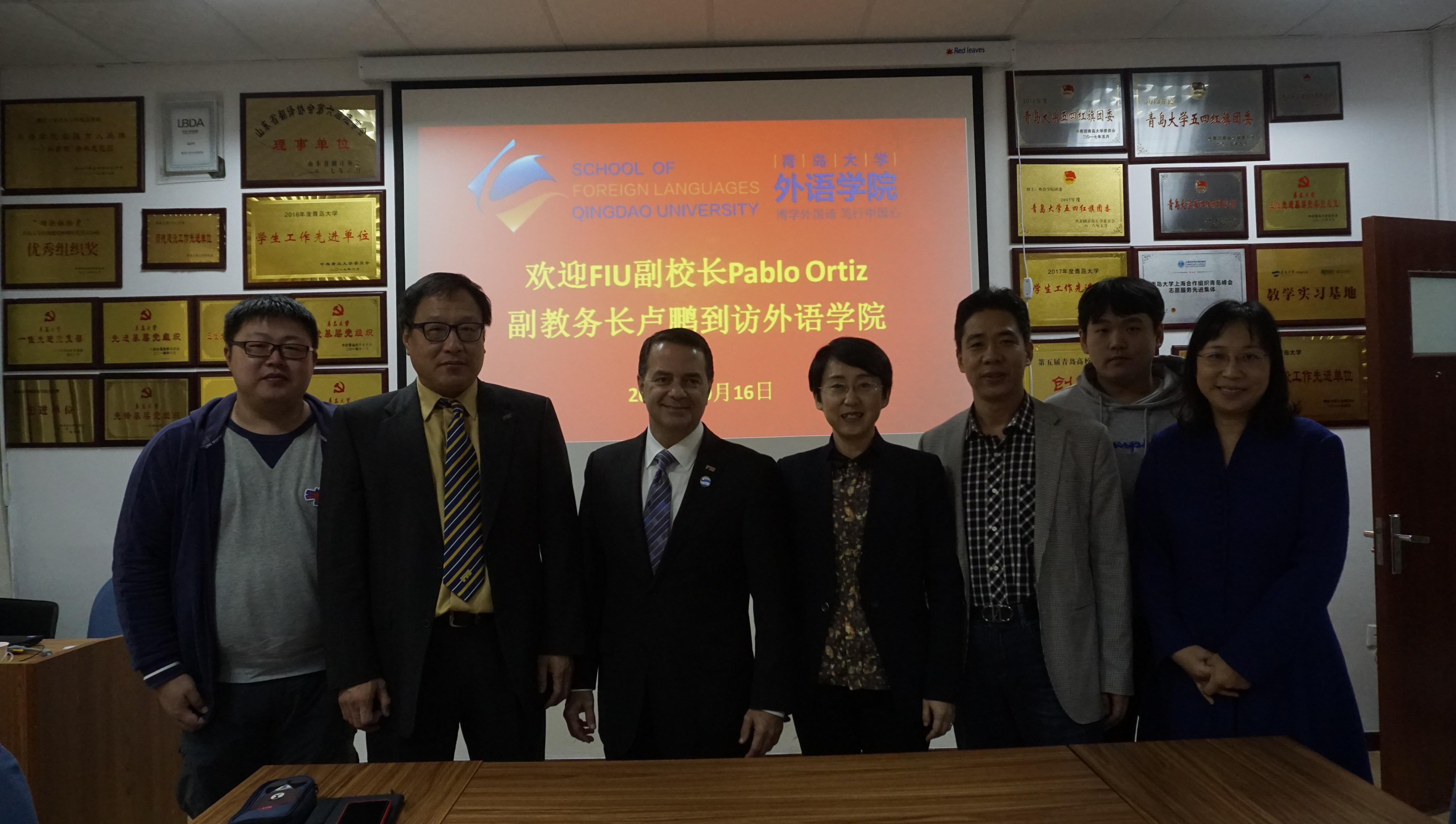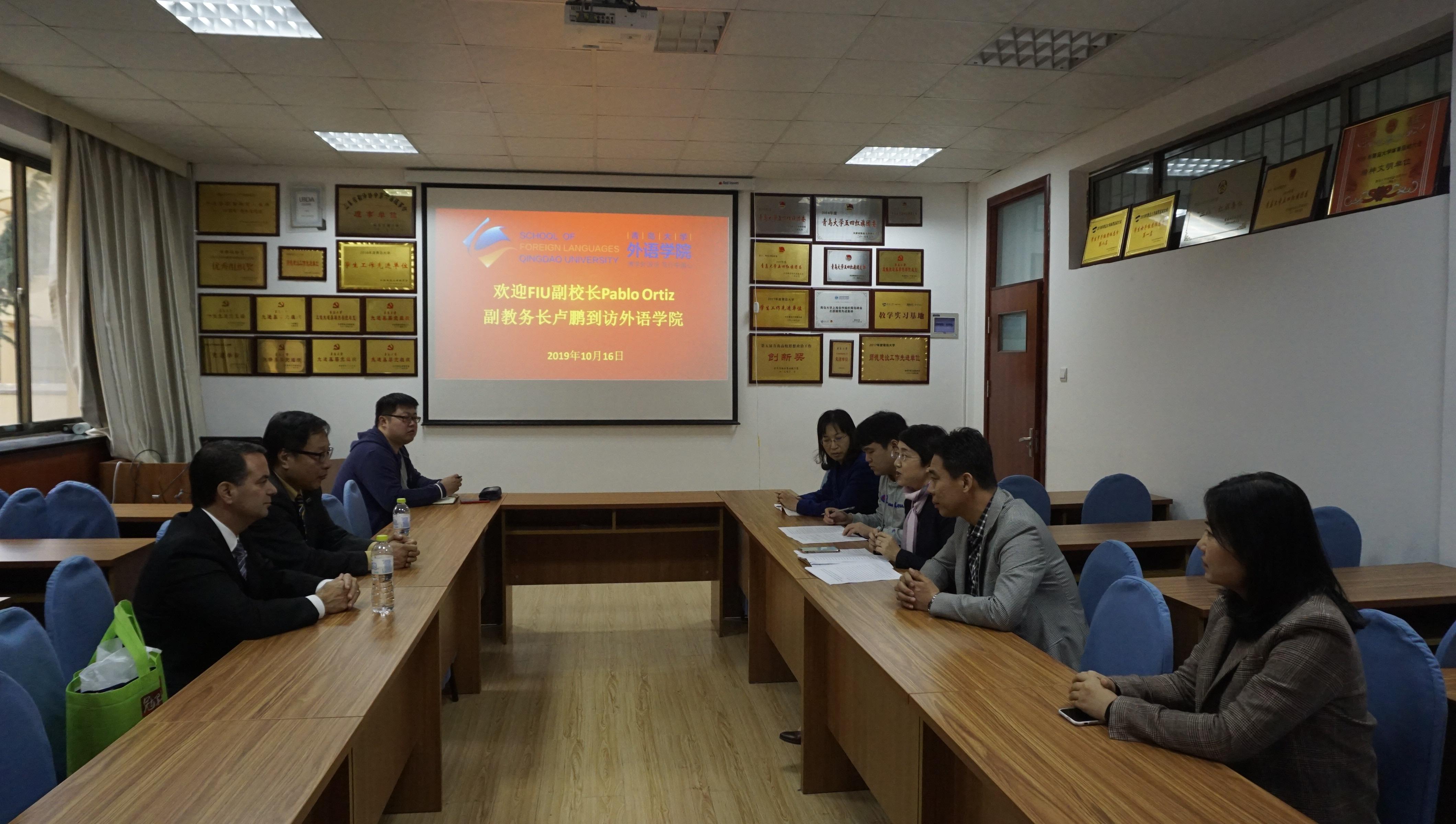 10月16日下午,FIU副校长Pablo Ortiz先生、FIU副教务长卢鹏到KY开元集团官网访问交流。学院党委书记王传永,院长卞建华,副院长宫英瑞,英语教育系主任秦硕谦,西班牙语系副主任栾勋业,外事助管范文楚参加座谈。