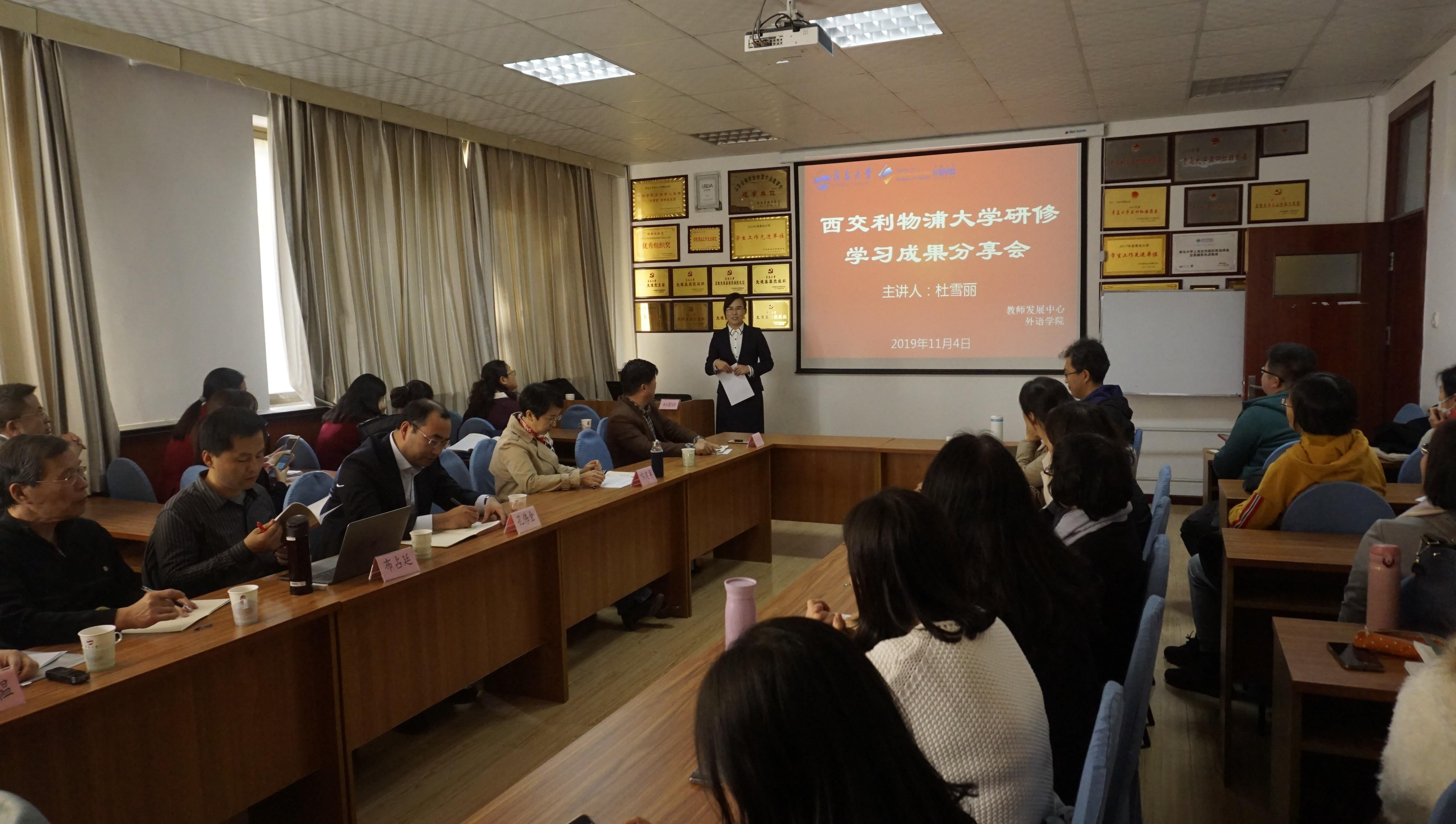 在分享会上,杜雪丽老师以“研究导向型教学研修”为题,从研究导向型教学的理念与价值、通过案例所获心得、“以学为中心”的反思等三个方面对此次赴西交利物浦大学研修学习的成果进行了分享。