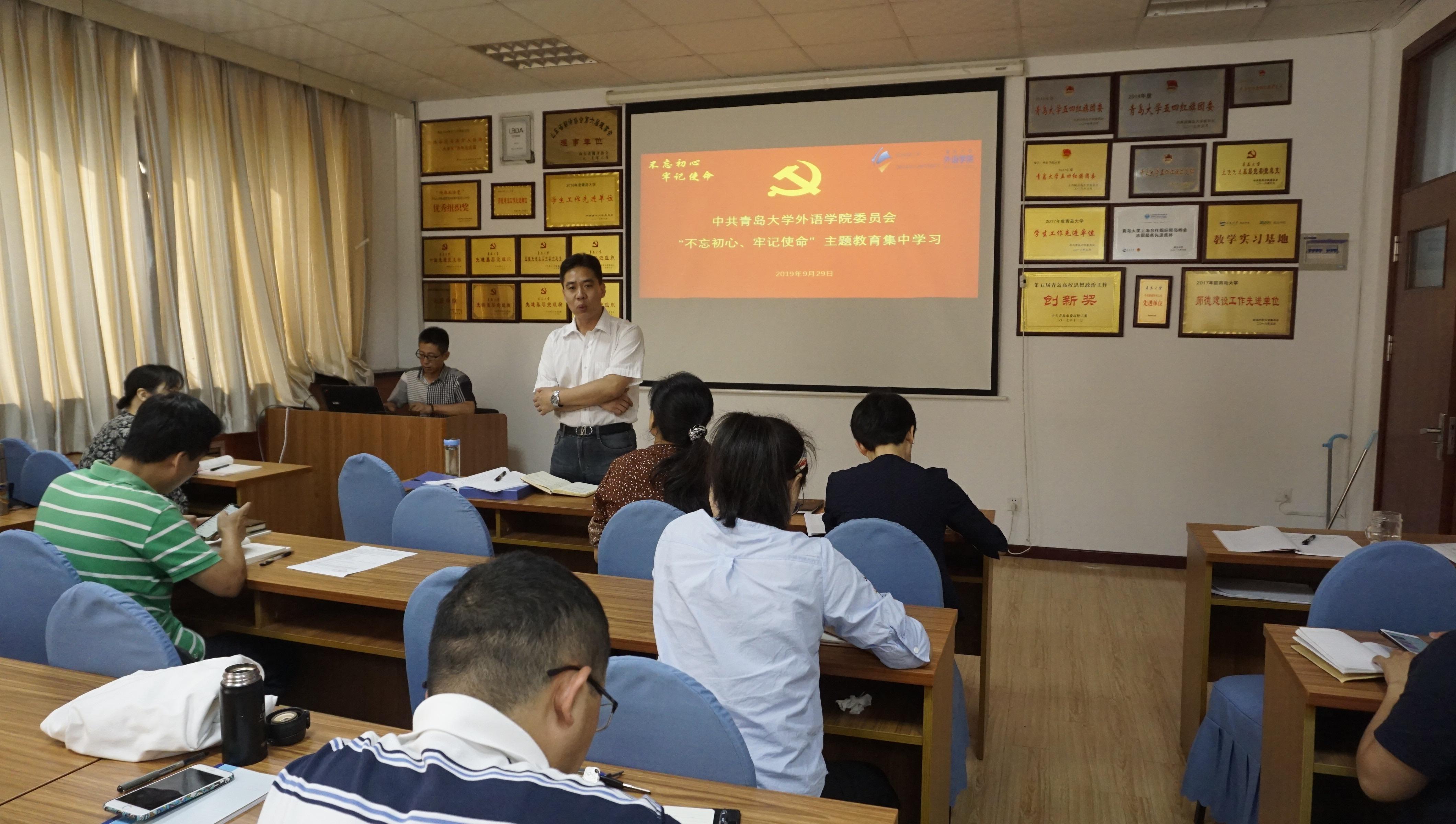 按照学校关于“不忘初心、牢记使命”主题教育的部署,9月29日,学院党委组织在博文楼312会议室开展主题教育集中学习,全体教职工党员参加,学院党委书记王传永主持。