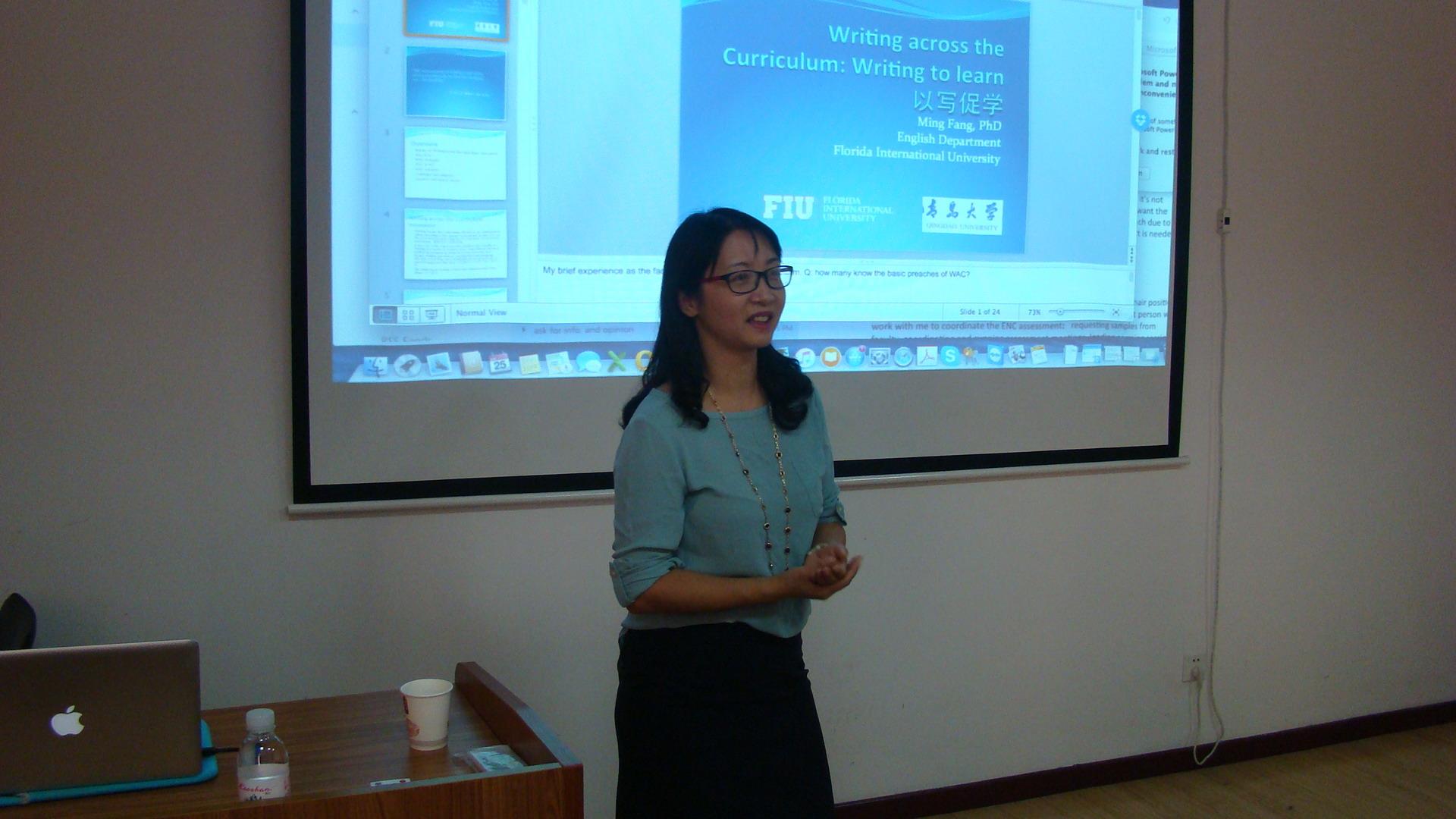 此外,方明博士还为KY开元集团官网师生做了题为“Writing Across Curriculum : Writing to Learn 以写促学”的专题学术讲座,介绍美国大学课程学习中写作的重要性和教学实践中以写促学的理念,并通过展示各类学科以写促学习的实例,探讨以写促学的意义、具体方法及挑战。