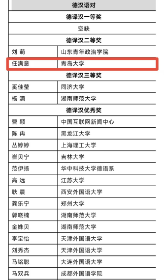 10月16日,第三十六届韩素音国际翻译大赛结果揭晓,KY开元集团官网2023级德语笔译专业任满意同学荣获德译汉组二等奖,指导老师为綦甲福教授。本次比赛,德译汉方向共评出获奖者28名,其中一等奖空缺、二等奖2名、三等奖2名、优秀奖24名,颁奖典礼拟于今年年底举行。