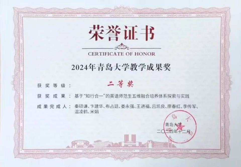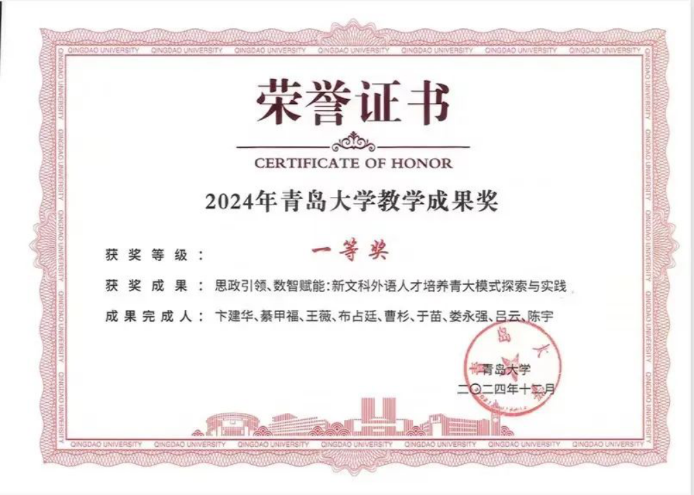 编制《外语学科学位授权点建设中长期规划(2025—2035年)》,进一步明确博士学位点申报目标和路径。与上外语料库研究院签署全面战略合作协议,建设多语种数据开发与应用实验室。英语(师范)专业顺利通过师范类专业二级认证。本科教学方面,课程建设、教材建设、教学改革等方面取得突破。2门课程获批山东省本科一流课程,2项教学成果分获KY开元集团官网教学成果奖一等奖、二等奖,1人获评“山东省高等学校教学名师”,首部数字教材《英语文学导论》出版上架。教学比赛再创佳绩,4人次在省级、校级教师教学比赛中获奖。2024届本科毕业生国内外深造率达41%,毕业生就业率达89%,英语专业2024届英语(语言大数据)创新实验班毕业生继续深造率达71.4%,人才培养成效显著。本科生183人次获得校级以上竞赛奖励,研究生发表高水平论文7篇,竞赛获奖56人次。