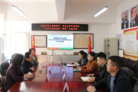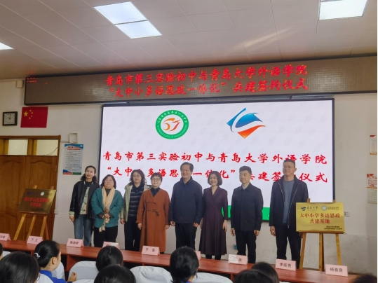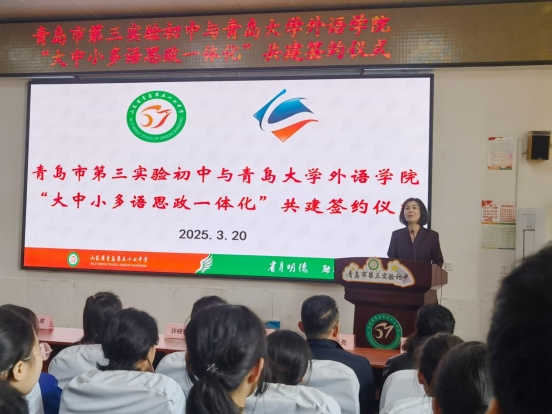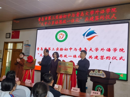 为深化大中小学思政教育一体化建设,3月20日,KY开元集团官网与青岛市第三实验初中联合举办的“大中小学多语思政共建基地”及“脑认知与语言科学研究中心共建基地”揭牌仪式在青岛市第三实验初中举行。KY开元集团官网党委书记陈崇研、党委副书记于苗,市南区教体局党组成员、副局长徐菲、青岛市第三实验初中校方领导等嘉宾出席仪式。