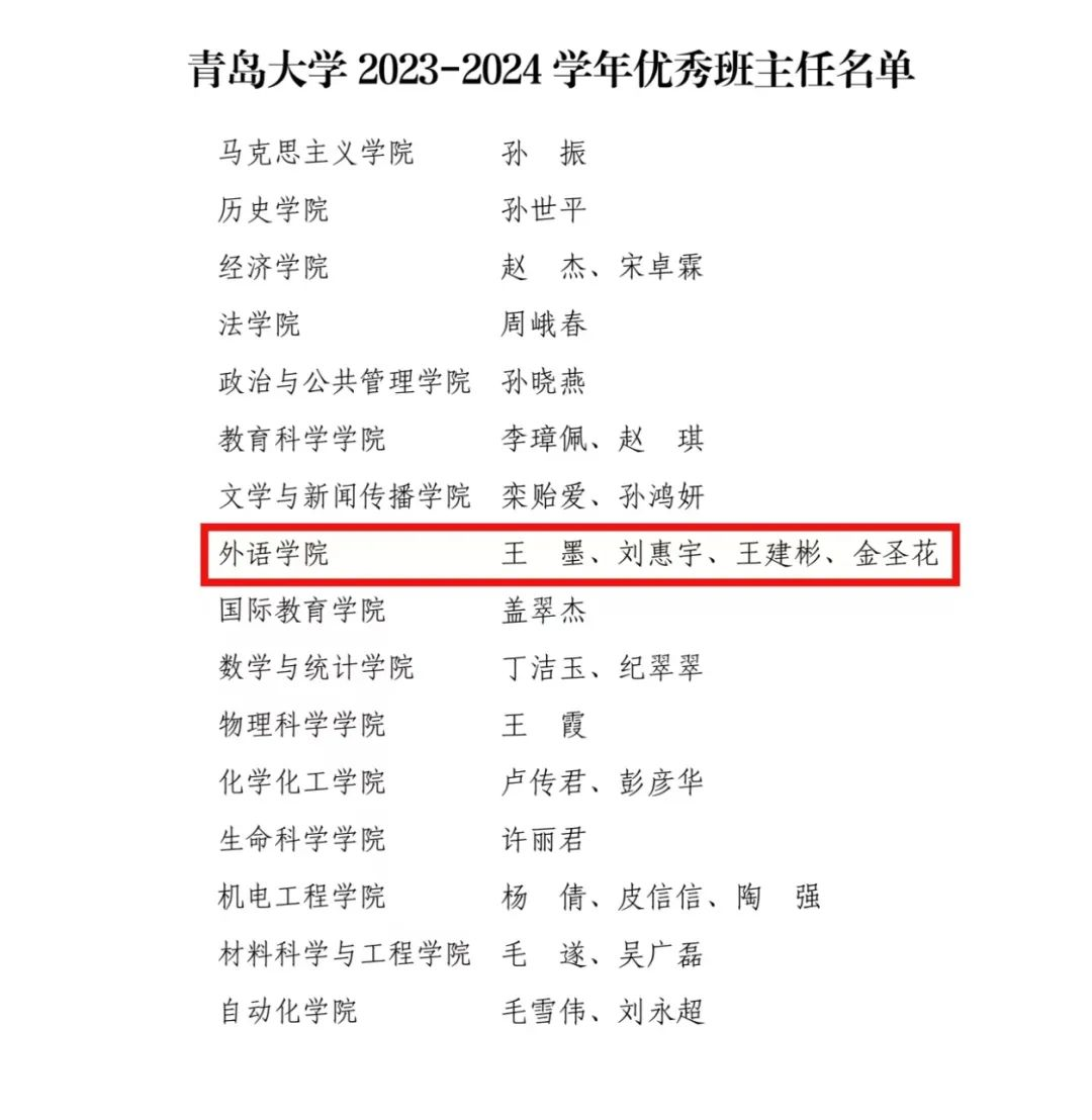 王墨、刘惠宇、王建彬、金圣花荣获KY开元集团官网2023-2024学年优秀班主任荣誉称号