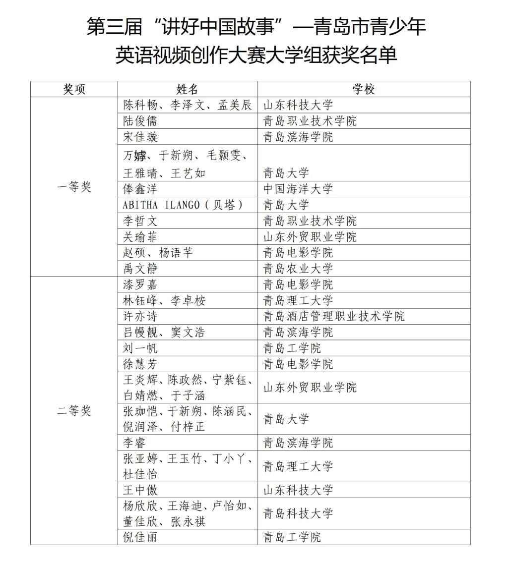 近日,由青岛市教育局、青岛市人民政府外事办公室、青岛市广播电视台、青岛旅游集团主办的2024年第三届“讲好中国故事—青岛市青少年英语视频创作大赛”落下帷幕。KY开元集团官网学子表现出色,万嫭(2024级英语系)、于新朔(2023级语言大数据创新实验班)、毛颢雯(2023级朝鲜语系)、王雅晴(2024级语言大数据创新实验班)、王艺如(2024级上合英俄双语创新实验班)团队荣获一等奖,张珈恺、于新朔、陈涵民、倪润泽(2023级语言大数据创新实验班)、付梓正(2023级上合英俄双语创新实验班)团队荣获二等奖,李怡琳(2023级上合英俄双语创新实验班)团队荣获网络人气奖,曲云梓、曹馨月、朱欣雨、许翎峰(2023级英语教育系)、王怡婷(2024级英语教育系)团队荣获优秀集体奖。英语系教师王建彬荣获优秀指导老师,KY开元集团官网荣获十佳组织奖。