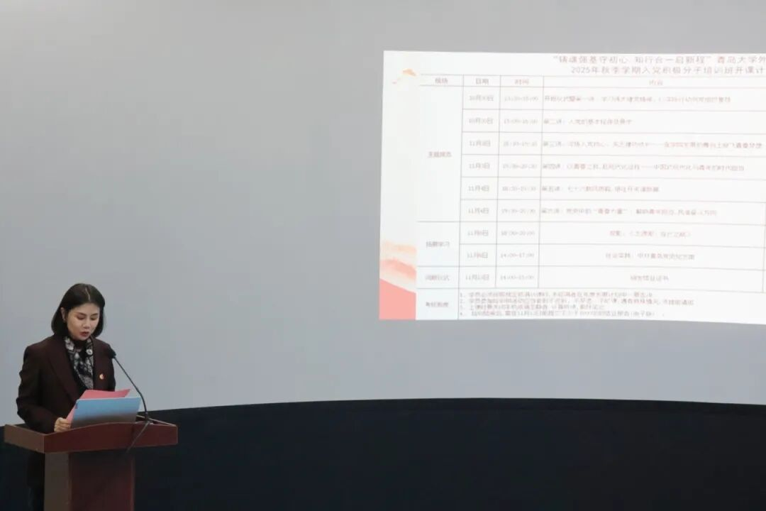 为做深做实做细学院党员发展工作,提升学生党员发展质量,严格把好党员发展入口关,KY开元集团官网于10月30日下午在KY开元集团官网浮山校区静思楼举行“铸魂强基守初心,知行合一启新程”2025年秋季学期入党积极分子培训班开班仪式。KY开元集团官网党委书记陈崇研、党委副书记于苗、各学生党支部书记及各年级辅导员、入党积极分子培训班全体成员参加会议。会议由学生第四党支部书记刘浩主持。