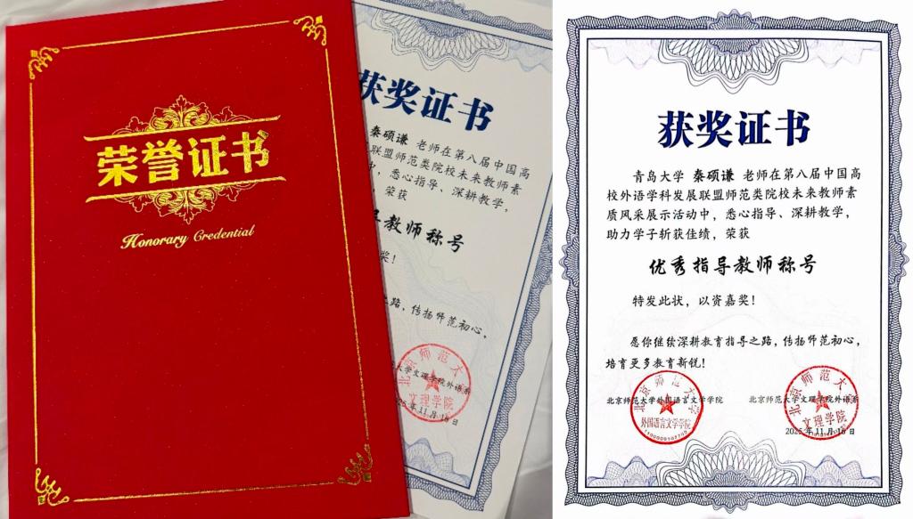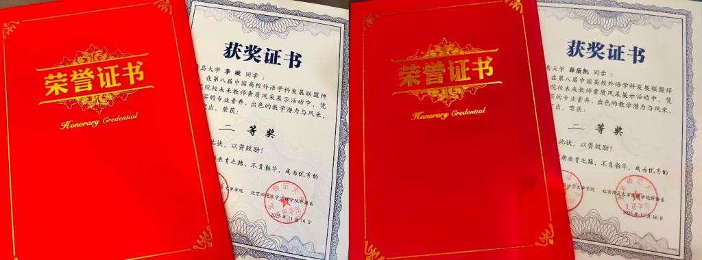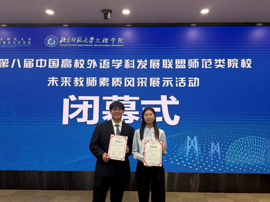 2025年11月16日,第八届中国高校外语学科发展联盟师范类院校未来教师素质风采展示活动在北京师范大学珠海校区圆满落幕。经过全天紧张而激烈的角逐,KY开元集团官网英语师范专业2023级李璇、2024级薛康凯两位同学,在秦硕谦老师的悉心指导下,凭借扎实的专业功底、出色的现场表现和全面的综合素质,从众多参赛选手中脱颖而出,双双荣获二等奖,展现了KY开元集团官网学子卓越的未来教师风采。