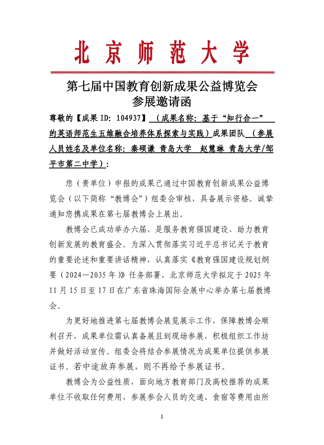 11月15日至17日,由北京师范大学主办的第七届中国教育创新成果公益博览会在广东珠海国际会展中心举办。本次教博会以“汇聚•共享•创新——推动教育创新发展,服务教育强国建设”为主题,“展”“论”结合,近2000家单位参展,举行论坛50余场,论坛超千场。KY开元集团官网英语教育系主任秦硕谦老师与学科教学(英语)研究生赵慧琳受邀参与本次博览会,展示KY开元集团官网教育创新成果——《基于“知行合一”的英语师范生五维融合培养体系探索与实践》。