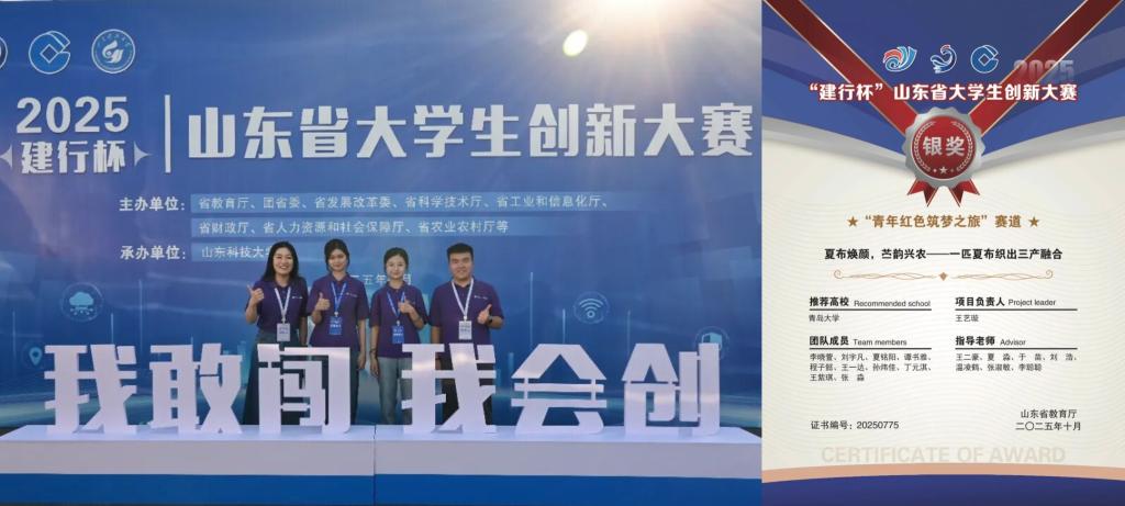 2025年7月,由山东省教育厅等多部门联合主办的“建行杯”山东省大学生创新大赛(2025)决赛于山东科技大学举行。经过层层选拔和多轮激烈角逐,KY开元集团官网由王二豪、夏淼、于苗、刘浩、温凌鹤、张淑敏、李聪聪担任指导教师,王艺璇、李晓萱、刘宇凡、夏铭阳、谭书雅、程子懿、王一达、孙炜佳、丁元淇、王紫琪、张淼学生团队申报的“青年红色筑梦之旅”赛道创意组项目《夏布焕颜,苎韵兴农——一匹夏布织出三产融合》,凭借扎实的创新理念与可落地的实践方案,斩获本届省赛银奖,为学院创新创业成绩单再添浓墨重彩的一笔!