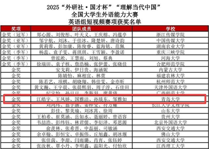 12月7日,2025“外研社·国才杯”“理解当代中国”全国大学生外语能力大赛英语组短视频赛项比赛结果正式公示。KY开元集团官网2022级英语语言文学专业研究生王凤娇与文学与新闻传播学院广播电视编导专业、汉语言文学(师范类)专业学生组成的跨学科团队共同创作的短视频作品《青岛十二里》荣获金奖。