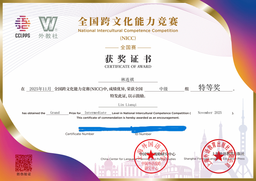 在2025年11月举办的全国跨文化能力考试暨全国跨文化能力竞赛中,KY开元集团官网学子表现出色,22级英语教育系林连祺同学获中级组国赛特等奖。