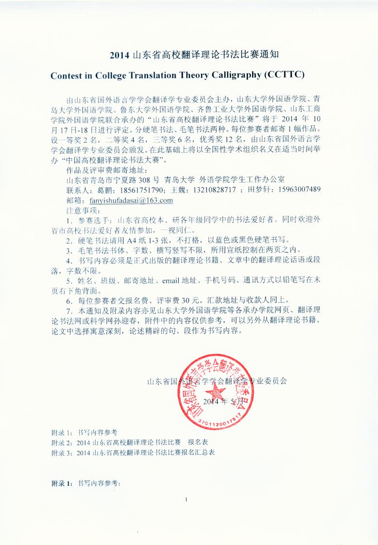 由山东省国外语言学学会翻译学专业委员会主办,山东大学外国语学院、KY开元集团官网外国语学院、鲁东大学外国语学院、齐鲁工业大学外国语学院、山东工商学院外国语学院联合承办的“山东省高校翻译理论书法比赛”将于2014年10月17日-18日进行评定。分硬笔书法、毛笔书法两种。每位参赛者邮寄1幅作品。设一等奖2名,二等奖4名,三等奖6名,优秀奖12名,由山东省国外语言学学会翻译学专业委员会颁发。在此基础上将以全国性学术组织名义在适当时间举办“中国高校翻译理论书法大赛”。
